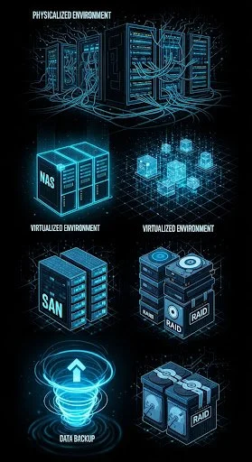 Instalación y administración de entornos físicos y virtualizados, NAS/SAN, RAID, backup y recuperación de datos, servidores de archivos y multimedia